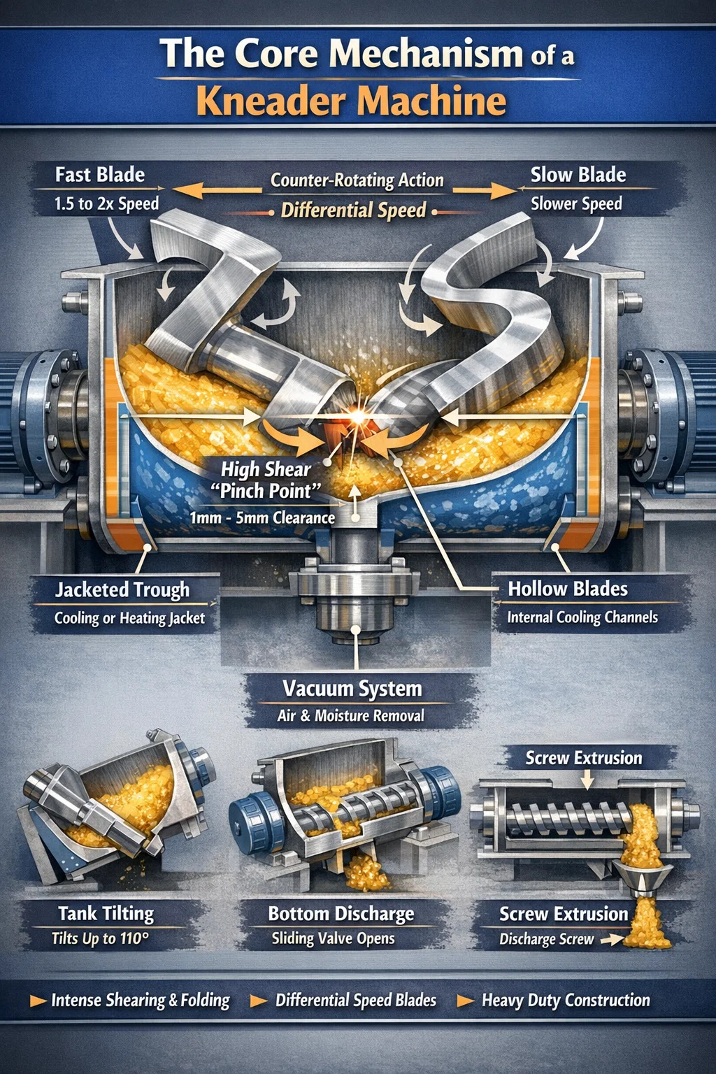 A mașină de frământat funcționează prin utilizarea unei perechi de lame contrarotative (de obicei în formă de Z sau lame Sigma) care funcționează la viteze diferite într-un jgheab în formă de W. Obiectivul principal este de a supune materialelor cu vâscozitate ridicată sau semi-solide forfecare intensă, pliere și compresie . Spre deosebire de mixerele standard care doar mișcă materialul, un frământat forțează substanța prin spații înguste între lame și pereții jgheabului, asigurând un amestec omogen de ingrediente care altfel sunt rezistente la curgere.