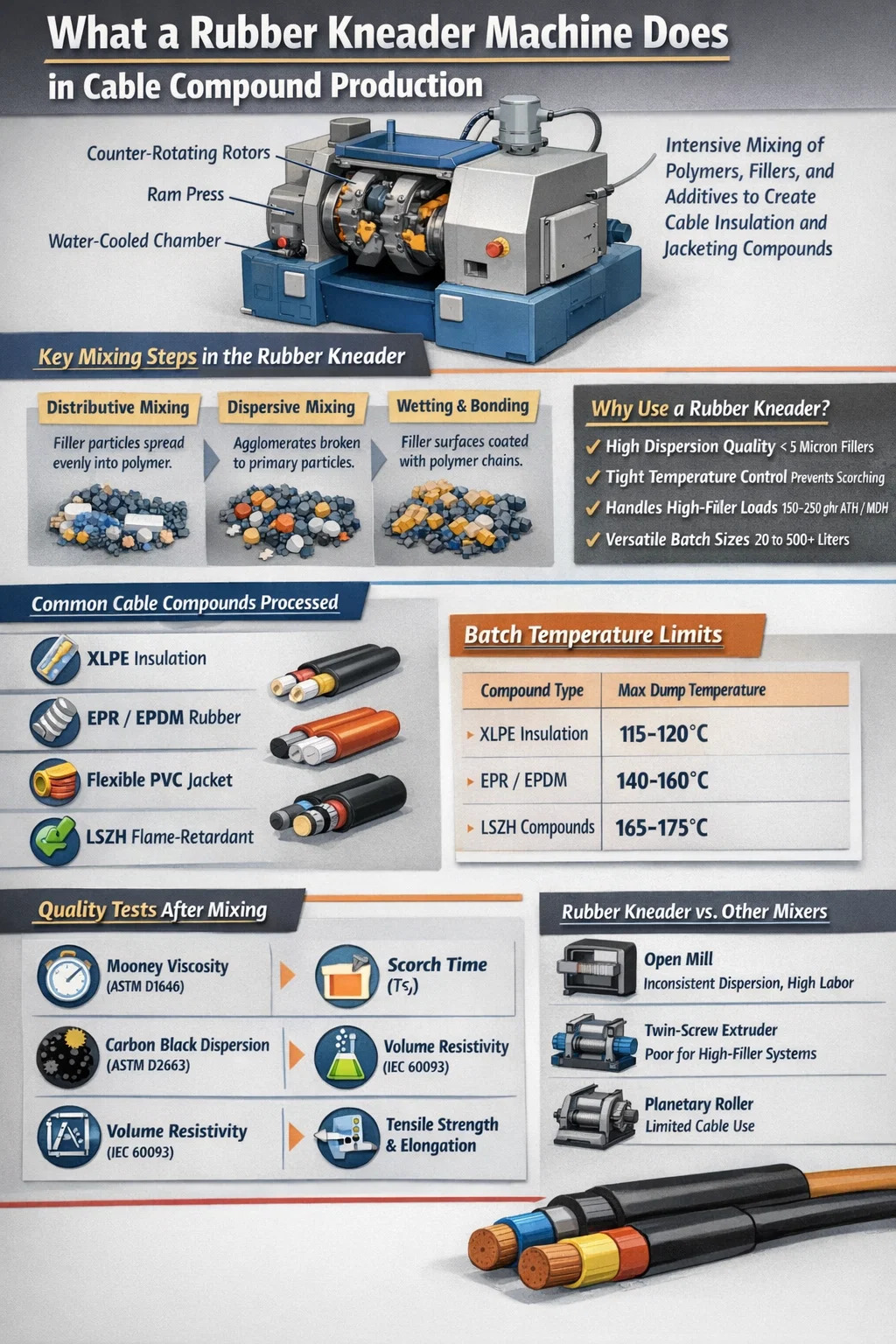 O mașină de frământat de cauciuc - numită și malaxor intern sau frământător de dispersie - este echipamentul de amestecare de bază folosit pentru a transforma materialele de bază din cauciuc brut sau polimer în compuși de cablu finiți gata de extrudare. În fabricarea cablurilor, compusul trebuie să îndeplinească cerințe stricte electrice, mecanice și termice. Frământatul de cauciuc realizează acest lucru prin aplicarea unei tensiuni intense de forfecare, compresie și căldură pentru a amesteca elastomeri, materiale de umplutură, plastifianți, antioxidanți, retardanți de flacără și agenți de vulcanizare într-o masă uniformă, procesabilă.