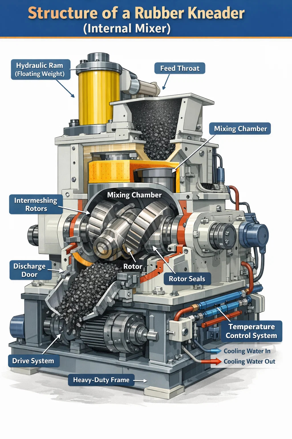Structura de bază a unui frământat de cauciuc constă din șase sisteme primare: camera de amestecare, rotoarele, pistonul hidraulic (greutate plutitoare), mecanismul ușii de descărcare, sistemul de control al temperaturii și sistemul de antrenare. Fiecare joacă un rol mecanic distinct, iar înțelegerea modului în care interacționează dezvăluie de ce frământatoarele interne au devenit standardul industriei pentru amestecarea cauciucului în fabricarea anvelopelor, etanșări, garnituri, furtunuri și produse tehnice din cauciuc.
