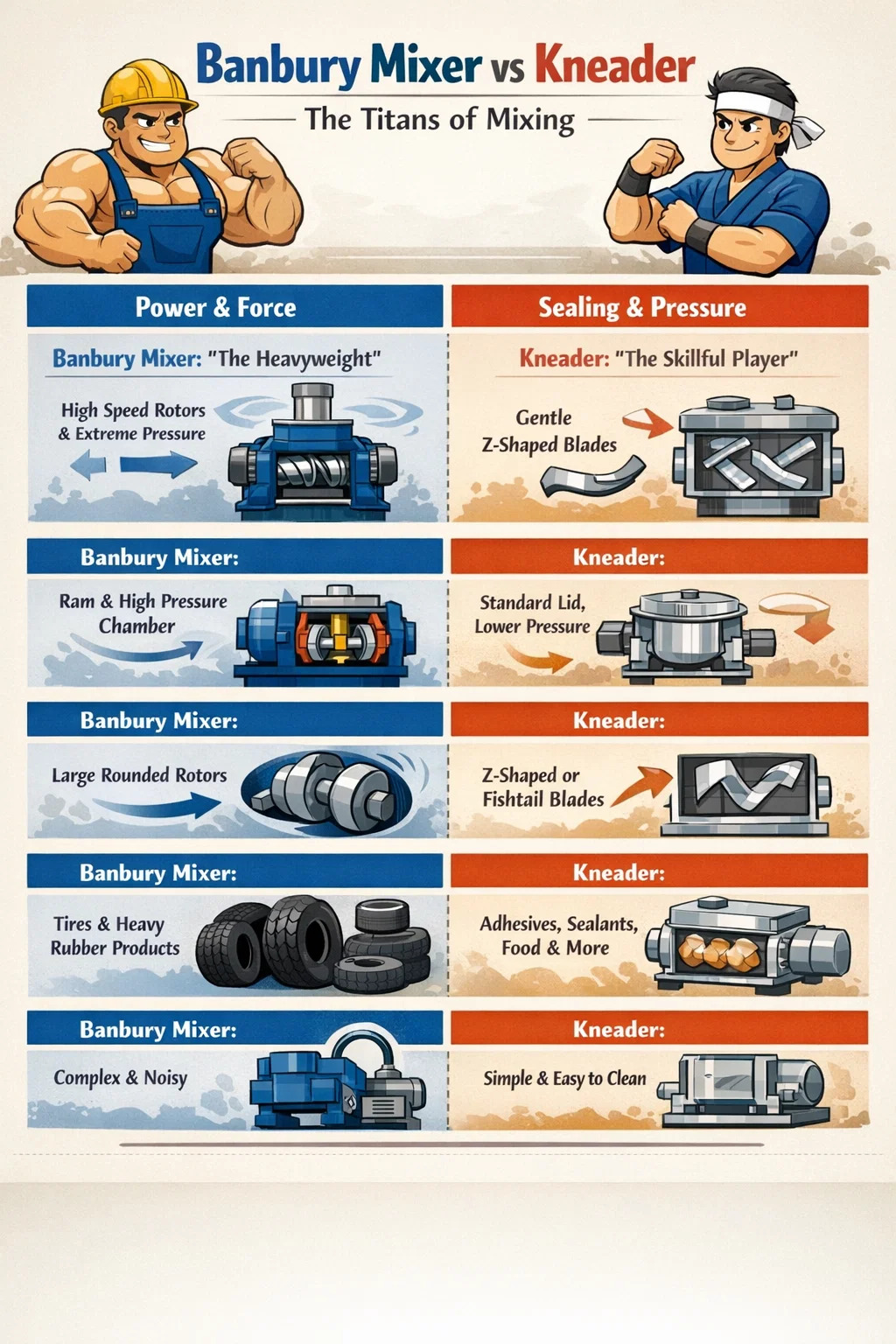 În lumea prelucrării cauciucului și a materialelor plastice, **mixerele și frământările Banbury** sunt ca doi oameni puternici cu personalități diferite. Deși ambele pot amesteca uniform materii prime vâscoase, ele diferă semnificativ în metodele lor de lucru și putere.